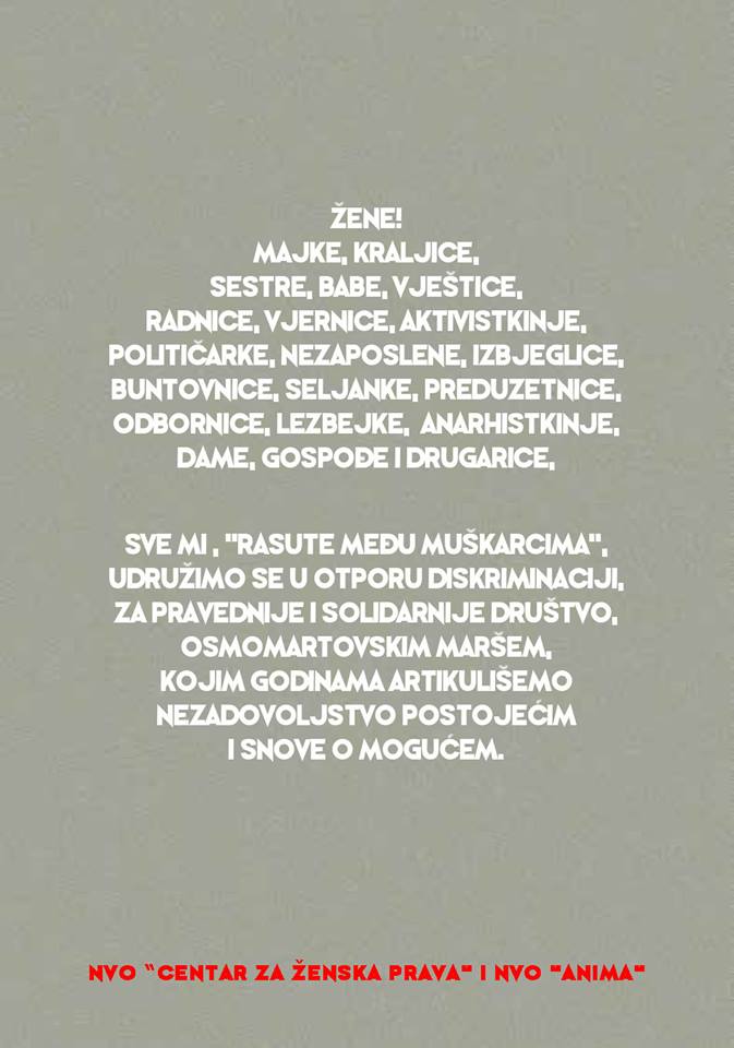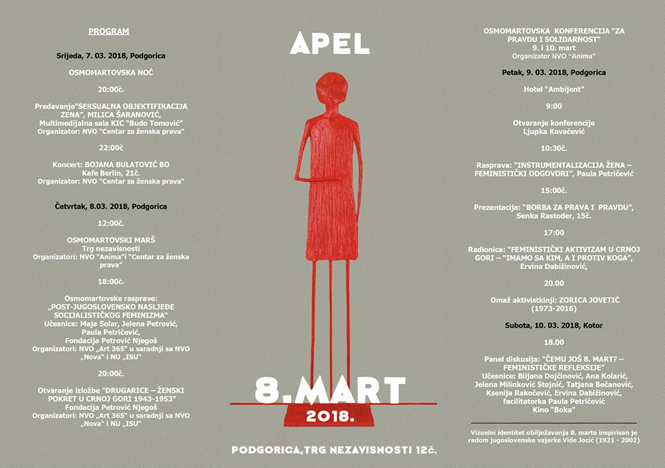 "What else is the 8th of March - feminist reflection" - is the name of a panel discussion organized by the Secretariat for Culture, Sports and Social Activities of the Municipality of Kotor and the Center for Women and Peace Education "Anima" from Kotor, on Saturday. March starting at 6 pm at the Boka Cinema in Kotor.