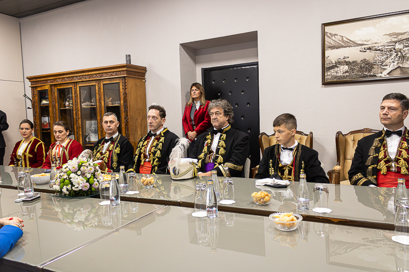 Predsjednik Opštine Kotor Vladimir Jokić, povodom 21. novembra - Dana opštine Kotor, upriličio je svečani prijem za delegaciju Bokeljske mornarice Kotor, u kojoj su između ostalih bili njen predsjednik Denis Vukašinović, admiral Mirko Vičević, viceadmiral Andro Radulović, kao i mali admiral Matija Radimiri.