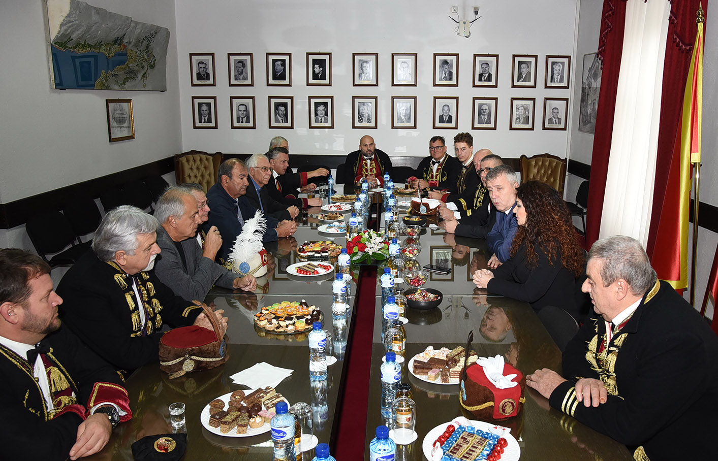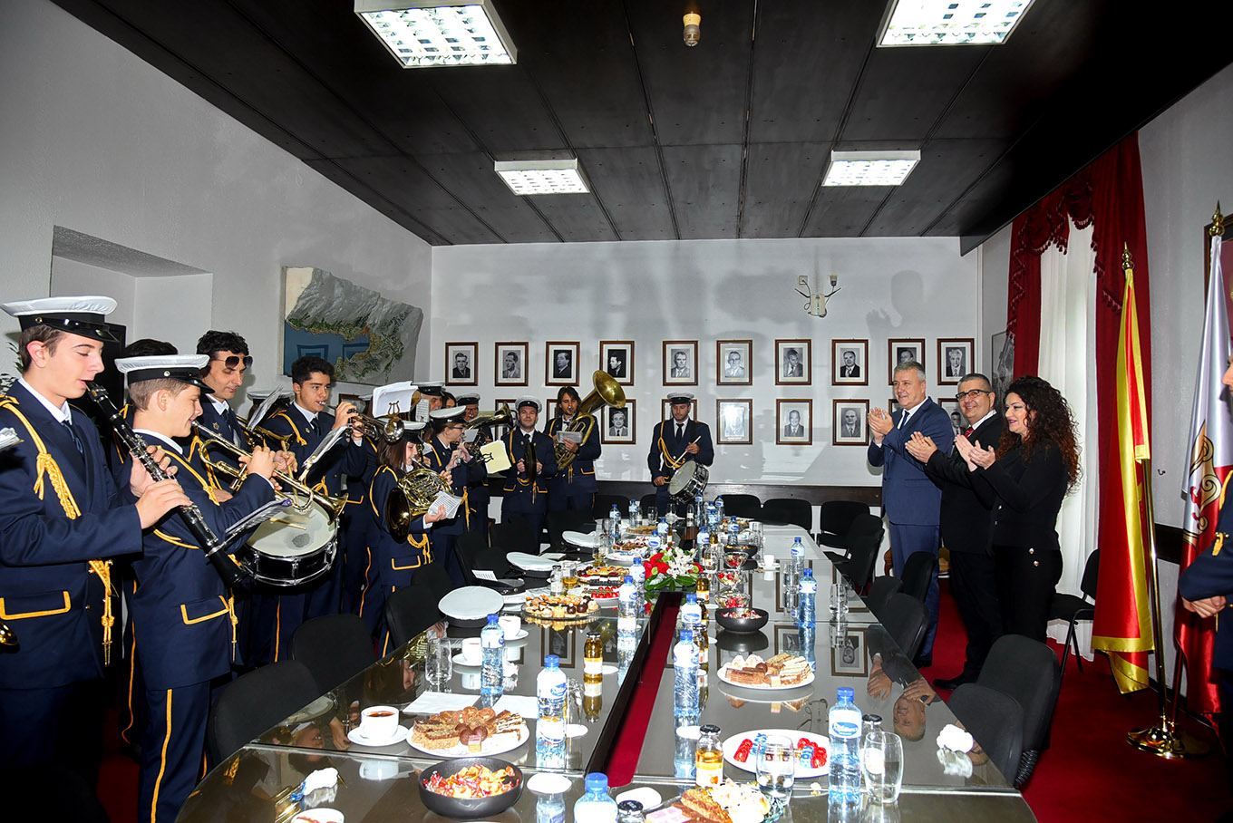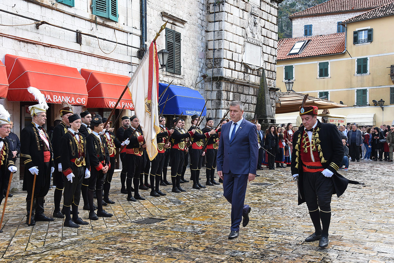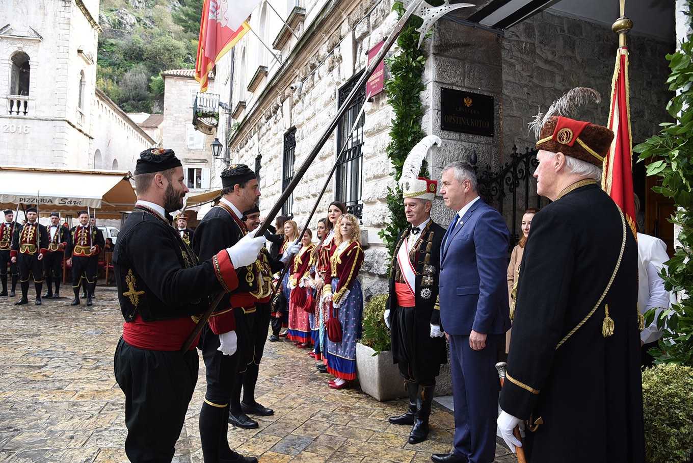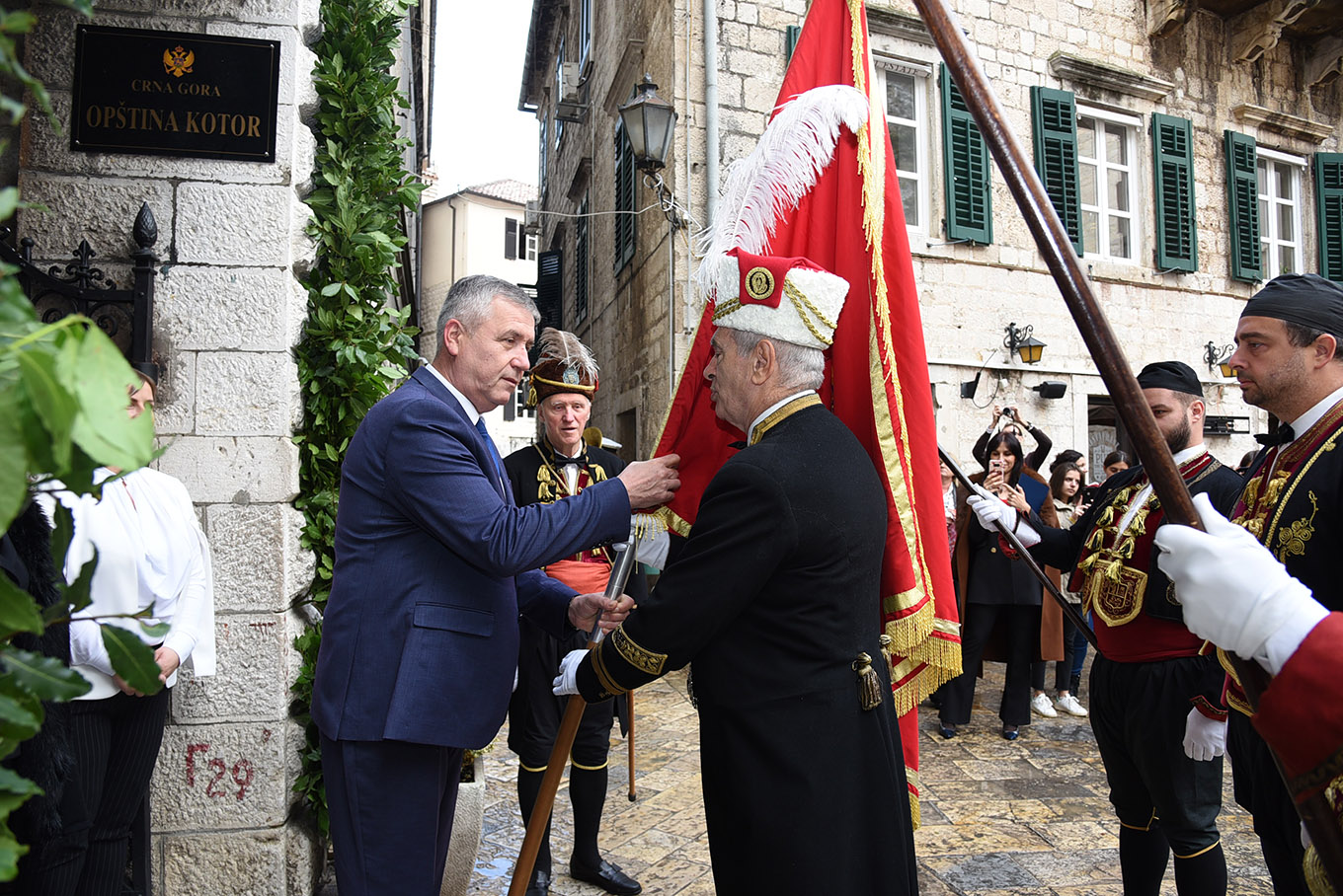 Uslijedio je svečani raport admirala Bokeljske mornarice Antuna Sbutege i predaja zastave od strane predsjednika Opštine Željka Aprcovića ispred zgrade Opštine Kotor.
