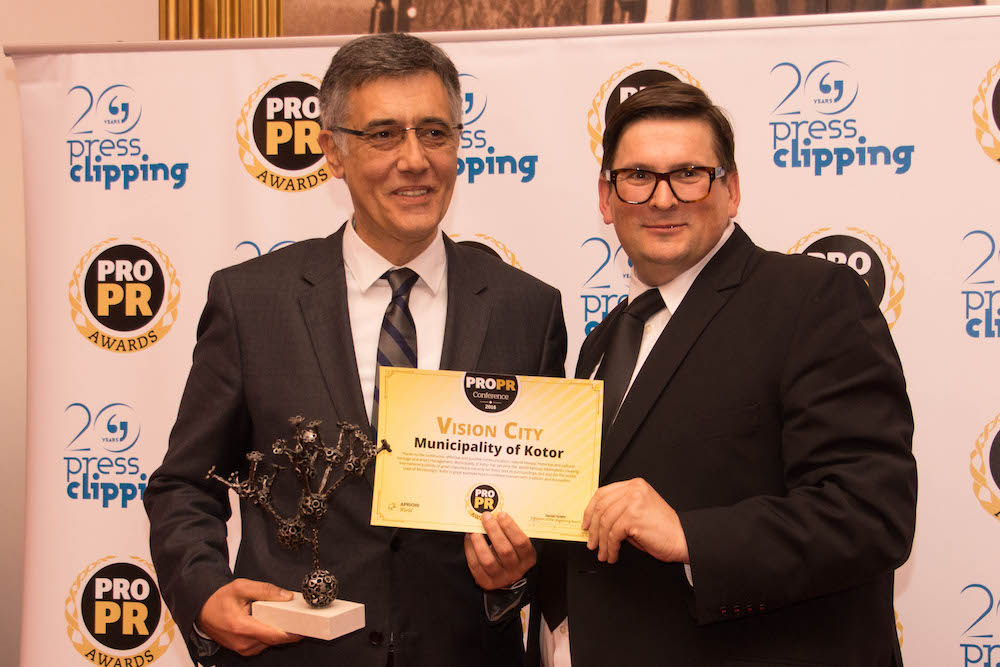 Organizacioni odbor međunarodne PRO.PR konferencije koju organizuje "Apriori world", na sinoćnjoj svečanoj dodjeli nagrada uručio je Opštini Kotor priznanje PRO.PR Vision City. Predsjednik Opštine Kotor, dr Aleksandar Stjepčević, zajedno sa saradnicima, predstavnicima lokalnih i državnih institucija i preduzeća, prisustvovao je svečanoj večeri prilikom koje je i preuzeo nagradu.